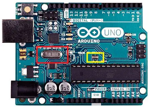 I think most of use agree that the "big silvery" thing on the board (red) is the famous 16 MHz crystal of the Arduino. That's what I've believed until very recently.