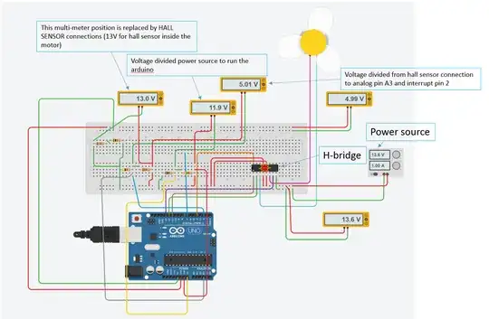 My Problem: The DC motor hall sensor sends out 2 high pulse of 11.3V - 13V with a duration of 2.8ms for each revolution. My Arduino interrupt pin doesn't read the high pulse as it gives me "0" count after motor spin (I run 50 loops and results remain the same).