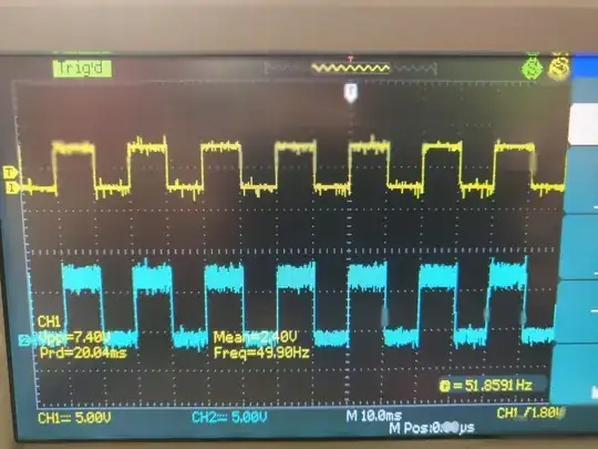 I am working on a phase detection project in which i am trying to find the order in which the incoming signal comes. I converted the 240v 50hz Ac signal to a 7v 50hz square pulse. when i connect one(7v 50hz) of the three lines to a digital pin on arduino it is properly detecting, but the problem is if i check the unconnected pins via oscilloscope i am getting the same signal which i connected as input, so when i connect another line to any other pin the two signals are getting added.