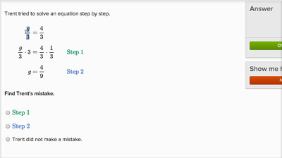 Practice spotting the mistake in someone else's work as they attempt to solve one-step equations.