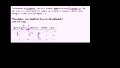 Compare features of linear functions, such as slope and intercepts, where the functions are given in different forms—tables, graphs, or formulas.