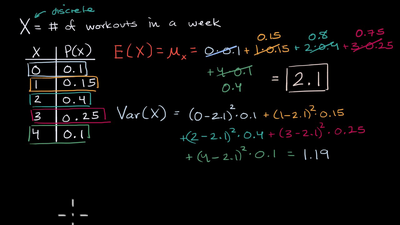 Discrete random variables occur in situations where we can list every possible outcome of a process, and assign each outcome a probability in a probability model. For example, how many heads will we get in three flips? We'll learn how to make a probability distribution, find some probabilities, and calculate the mean (or expected value), variance, and standard deviation of a random variable.