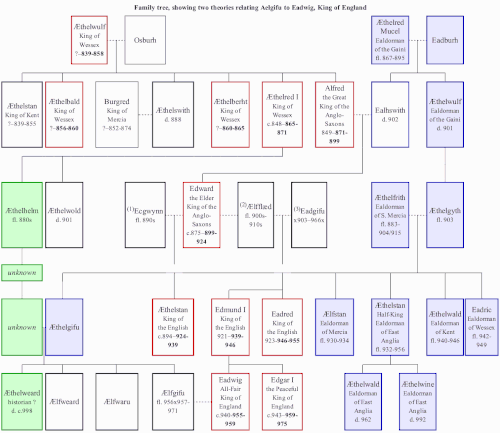 Her supposed will also provides the starting point for another, more widely regarded hypothesis.[10] In this document, she makes bequests to Ælfweard and Æthelweard, seemingly her brothers (one of whom was married to Æthelflæd), and to her sister Ælfwaru. Æthelweard and Ælfweard re-appear as brothers and thegns (ministri) in the witness list of a spurious royal charter dated 974.[11] This appears to be the same Æthelweard who regularly attests royal charters between 958 and 977 as the king's thegn[12] and may have moved on to become the illustrious ealdorman of the Western Provinces and author of a Latin chronicle,[13] in which he claimed descent from King Æthelred of Wessex (d. 871), fourth son of King Æthelwulf.[14] The conclusion which can be derived from these prosopographical byways is that if the ealdorman and chronicler Æthelweard was her brother, she must have shared with him a common ancestor in King Æthelred. In this light, Ælfgifu would have been Eadwig's third cousin once removed.
