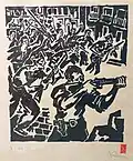 After returning to Belgrade, he created a set of graphics titled Blood-soaked Gold (Krvavo zlato) with the aim of displaying the lives of Yugoslav miners and workers. Although the collection was finished, he was unable to find a printer in Belgrade who would print his work. He printed 10 copies of the collection in his studio in 1936. With the help of architecture student Voja Midić, he reached printer Jovan Luks from Stari Bečej, who agreed to print the collection.[12] In January 1937, the first 250 copies were printed, and soon after, a second edition of 1,000 copies was published, which the writer Jovan Popović wrote the foreword for. The map of graphics depicting the difficult daily life of miners and arduous work, as well as the dissolute life of profiteers, was banned by the Belgrade City Administration in February of 1937.[1][13]