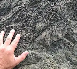 The layered sandstones and siltstones (mudstones) are seen in the cliff faces and also form the shore platform around the north and west sides of the park. These softer, generally yellow-brown rocks are approximately 19-20 million years old and are made up of the Waitamata formation (East Coast Bays facies) of early Miocene (Late Otaian) age.[7] Distortion and faulted dipping, of this once soft strata, can be seen both in the cliffs and in the small ridges of the rock platform extending out from the beach at low tide.