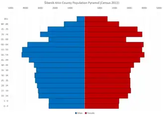 According to the 2021 census, Šibenik-Knin County has a population of 96,381.[2] Croats make up a majority with 88,60% of the population. The Serbs are the second largest ethnic group (8,37%).[6]