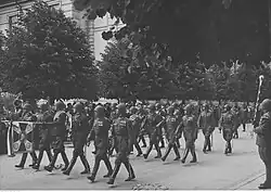 On 27 April 1922, its 1st battery was transferred to the 10th cavalry division, and a new battery was created in Białystok in its place. A similar fate befell the 2nd Battery, which in 1924 was transferred to the 12th Horse Artillery Division. In the same year, the 3rd Battery was disbanded. Almost throughout the interwar period, the division was a two-battery unit. It consisted of the commander's squad, the communications platoon, the quartermaster's office, and the 1st and 2nd batteries. The 3rd Battery was recreated only in 1937 in Ostrołęka on the basis of the 2nd battery of the disbanded 12th Horse Artillery Regiment.[7] Due to the limited space in Białystok, it continued to be stationed in Ostrołęka in the barracks of the 5th Uhlan Regiment. In 1927, by order of the 3rd Artillery Department of the MSWojsk. L. 2000/Org. og., the 8th Horse Artillery Regiment was renamed the 14th Horse Artillery Regiment.[6]
