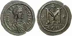 Zghursky then claimed that recently discovered manuscripts in Matenadaran supposedly mentioned Kiev as a settlement 2,500 years ago, and sent documents of this to UNESCO in Paris. Its head replied that UNESCO does not celebrate days of cities; at most, it could consider recognising the formation date of the state of Kievan Rus'.[5] The city council then offered to celebrate the 2000th anniversary of Kievan Rus' and Kiev, but the European experts at the UNESCO headquarters disagreed with the new date suggested.[5] Another suggestion made previously by numismatists was basing the foundation on a Roman follis coin of Byzantine emperor Anastasius I Dicorus (r. 491–518) found in Zamkova Hora; this argument would eventually prove to be decisive.[6] When a 1500-year-old anniversary was discussed, the chairman of the National Academy of Sciences of Ukraine Borys Paton who was also present half-jokingly told mayor Zghursky: "Hurry up and go to the podium and agree. Otherwise, they will cut off another few hundred years!"[5] Zghursky did so, and apparently this is how UNESCO reached the official decision that Kiev was allowed to celebrate its '482 foundation' in 1982.[5]