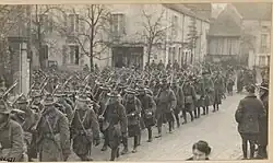The 168th Infantry arrived at the port of New York on 25 April 1919 on the troopship USS Leviathan and was demobilized on 17 May 1919 at Camp Dodge. Per the National Defense Act of 1920, the 168th Infantry was reconstituted in the National Guard in 1921 and allotted to Iowa. It was concurrently relieved from the 42nd Division and assigned to the 34th Division. It was reorganized on 13 July 1921 with the regimental headquarters organized and federally recognized at Des Moines. The entire regiment, or elements thereof, was called up to perform the following state duties: tornado relief work at Neola and Persia, Iowa, 7–8 June 1925; riot control during the “Cow War” at Cedar County/Burlington, Iowa, 21 September–25 November 1931; the 1st and 3rd Battalions performed martial law in Plymouth and Crawford Counties, respectively, during the Farmers' Holiday Association disturbances, 28 April–17 May 1933; the 1st Battalion performed martial law at Newton, Iowa, during the labor troubles at the Maytag washing machine plant, 19 July–6 August 1938. The regimental headquarters was relocated on 27 January 1937 to Council Bluffs. The 168th Infantry conducted annual summer training most years at Camp Dodge from 1921–39. For at least two years, in 1938 and 1940, the regiment also trained some eighteen company-grade Organized Reserve infantry officers of the 88th Division at Camp Dodge and Camp Ripley, Minnesota. The regiment was inducted into federal service at home stations on 10 February 1941 and moved to Camp Claiborne, Louisiana, where it arrived on 3 March 1941. In August-September 1941, it participated in the Louisiana Maneuvers.[2]