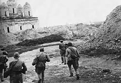 On August 8 units of the 25th Panzergrenadier Division appeared on the approaches to Khotynets. Further reserves arrived the next day and two armored trains were coursing along the railroad. Despite this, on August 9 fighting began on the immediate approaches to the town and individual strongpoints changed hands several times. By day's end elements of the 36th Guards Corps and the 1st Tanks were fighting along the outskirts of Abolmasovo, Voeikovo and Khotynets itself while units of 8th Guards Corps and 25th Tanks outflanked Khotynets from the south and cut the railroad. The town was now outflanked from three sides and on the morning of August 10 was completely cleared of German forces as remnants fell back to the west; the battle had cost them 7,500 officers and men, 70 armored vehicles and 176 guns and mortars. In the pursuit the next day the 36th Corps reached the eastern outskirts of Yurevo and straddled the Khotynets–Karachev road southeast of Yakovlevo. The 169th was now moved to Bagramyan's reserve and concentrated in the area of Moshchenoe.[58] On September 5 it was assigned to 8th Guards Corps, but on September 19 it was moved to 63rd Army, still in Bryansk Front. In late September the Army was transferred to Central Front (soon renamed Belorussian Front) and the 169th soon became part of 40th Rifle Corps.[59]