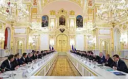 Russian President Vladimir Putin and his Ukrainian counterpart Viktor Yanukovych held the sixth "interstate consultation" on 17 December in Moscow.[36][37] Yanukovych flew to Moscow on the private jet airliner of Ukrainian oligarch (and alleged financier and chieftain of Yanukovych's Party of Regions[38][39]) Rinat Akhmetov.[40] After the meeting, Yanukovych stated "We've prepared a joint action plan to resolve trade and economic restrictions, a so-called road map that will significantly improve performance in this area" and added this would benefit the entire sectors of the economies of the two countries.[37] "Favourable conditions for the about 1.5 million people from Ukraine that are working in Russia" were also discussed.[41] According to President Putin and Russian presidential press secretary Dmitry Peskov this deal was "not tied to any conditions" and Ukraine's possible accession to the Customs Union of Belarus, Kazakhstan, and Russia was not addressed.[42][43] Peskov also added "it is our principled position not to interfere in Ukraine's affairs" and accused other countries of doing the opposite.[42] According to President Yanukovych, the trade situation between Russia and Ukraine required urgent intervention, and that it should be coordinated with other Commonwealth of Independent States (CIS) countries.[44] He also added referring to Russia–Ukraine relations, "We'll have to learn lessons for the future and not to repeat such mistakes".[45] And President Yanukovych also stated that Ukraine and Russia should strengthen cross-border and inter-regional cooperation "which create convenient conditions for the people".[46]