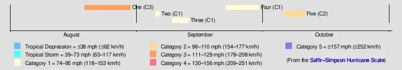 | One | August 19–30 | Category 3 hurricane | 115 (185) | 961 | Turks and Caicos Islands, Bahamas, Florida, Gulf Coast of the United States (Mississippi), Southeastern United States | $1 million | Unknown | [8] | ||