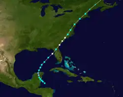 On September 25, a tropical storm was first noted in the western Caribbean, north of Honduras. Upon striking the Yucatán Peninsula shortly afterwards, the storm briefly weakened into a tropical depression. However, when the system emerged into the Gulf of Mexico, it attained tropical storm status once again. Steadily gaining strength, the cyclone reached hurricane status on September 28, after reports from the ship Emma D. Finney indicated such.[4] Moving north-northeastward, the storm made landfall near Cedar Key, Florida several hours later, with an estimated minimum central pressure of 981 mbar (29.0 inHg). The system briefly fell to tropical storm status over the state, but strengthened into a hurricane again after exiting near Jacksonville and crossing the Gulf Stream. It hit South Carolina as a hurricane that same day, with the center passing just east of Charleston and west of Wilmington.[15]: 13 The storm lost hurricane status again over eastern North Carolina. Thereafter, the system crossed the northeastern United States, becoming extratropical on September 30 over Maine. On October 1, it dissipated over eastern Canada.[3]