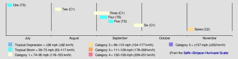 | Six | September 25–September 30 | Category 1 hurricane | 80 (130) | 981 | East Coast of the United States (Florida and South Carolina) | >$100,000 | Unknown | [8] | ||