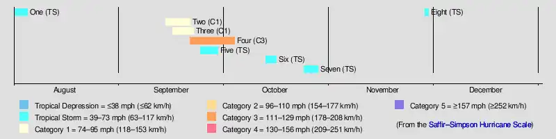 The track for the first known storm begins on August 1 near the Turks and Caicos Islands and ends after the cyclone struck New Brunswick four days later.[3] Three people drowned after that cyclone sank the schooner Vanname.[6] September featured four systems, three of which intensified into hurricanes.[3] High tides, heavy rainfall, and strong winds from the season's storm produced almost $500,000 in damage in Texas and Louisiana.[7] Later in September, the season's fourth cyclone caused devastation in areas throughout its path, inflicting more than $2 million in damage and at least 84 deaths, mostly on Curaçao.[8][9] Two tropical storms are known to have existed in October. The eighth and final cyclone of the season is estimated to have developed by November 28 near Exuma in the Bahamas. Moving northeastward, the system transitioned into an extratropical cyclone on November 29 prior to crossing Atlantic Canada.[3]