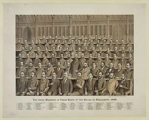 ![]() Results of the 1886 election in Ireland Conservative Liberal Unionist Irish Parliamentary Party | |||||||||||||||||||||||||||||||||||||||||||||||||