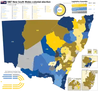 The 1887 New South Wales colonial election was held between 4 February and 26 February 1887. This election was for all of the 124 seats in the New South Wales Legislative Assembly and it was conducted in 37 single-member constituencies, 23 2-member constituencies, seven 3-member constituencies and five 4-member constituencies, all with a first past the post system.[1][2][3] Part 1 (section 13) of the Electoral Act of 1880 had awarded the right to vote to 'every male subject of Her Majesty of the full age of twenty-one years and absolutely free being a natural born or naturalized'.[4] The previous parliament of New South Wales was dissolved on 26 January 1887 by the Governor, Lord Carrington, on the advice of the Premier, Sir Henry Parkes.