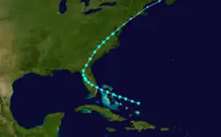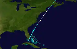 Based on a 1993 reanalysis led by meteorologist C. J. Neumann,[7] the official track begins on September 6 about 110 mi (175 km) north of Turks and Caicos Islands. Trekking west-northwestward, the system passed through the northern Bahamas on September 7. Around 00:00 UTC the next day, the system made landfall near present-day Palm Beach, Florida, with winds of 50 mph (85 km/h). After drifting while just north of Tampa, the cyclone turned northeastward.[5] Despite the system moving over land, it peaked with winds of 60 mph (95 km/h) early on September 9 while passing near Cedar Key,[5] which observed a barometric pressure of 999 mbar (29.5 inHg).[7] The storm reached Maryland before becoming extratropical on September 11. Continuing northeastward, the remnants crossed the Northeastern United States and entered Atlantic Canada before dissipating over southern New Brunswick on the next day.[5] Chenoweth proposed that this storm moved in a zigzag-type path over Florida and Georgia and later may have tracked far enough east to miss Long Island, New York, and instead strike Rhode Island.[4]