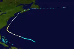| Nine | November 17–25 | Category 2 hurricane | 100 (155) | ≤982 | East Coast of the United States, Atlantic Canada | Unknown | 16 | [43][44] | ||