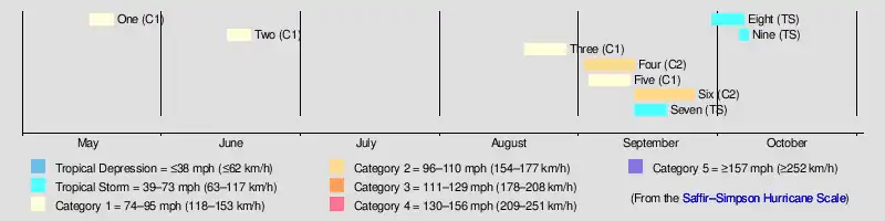 | Six | September 12–25 | Category 2 hurricane | 110 (175) | 982 | Lesser Antilles, Mexico (Quintana Roo), Southeastern United States (Louisiana and Alabama) |