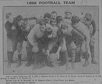 The Western University of Pennsylvania Athletic Association, with halfback William Gill as president, set up a seven-game schedule for the 1892 football season.[10] The team, led by captain Bert Smyers, compiled a 4–2 record and was outscored by a total of 46 to 38.[11]