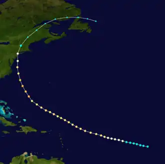 Less than a day later, the storm deteriorated to Category 2 strength.[2] Cape Hatteras, North Carolina experienced the hurricane on the morning of August 23 while its center passed less than 100 mi (160 km) offshore. Heading nearly due northward, the cyclone skimmed the New Jersey coastline, passing just east of Atlantic City,[4] and weakened further to Category 1 status.[2] On August 23 the storm was one of four hurricanes occurring simultaneously within the Atlantic Ocean.[5] On August 24 the storm moved ashore on western Long Island, in the New York City area. At 1200 UTC that day, while centered just inland, its maximum winds were estimated to have been 85 mph (135 km/h). It progressed northward through New England, quickly weakening. It was briefly downgraded to a tropical storm before becoming extratropical.[2] It dissipated fully on August 25, near the mouth of the Saint Lawrence River.[4]