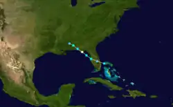According to the Weather Bureau, a "feeble disturbance" developed into a tropical storm near West End in the Bahamas early on August 2.[10] Three hours later, the storm made landfall in Hobe Sound, Florida, with winds of 40 mph (65 km/h). The system briefly weakened to a tropical depression on August 2, before re-strengthening into a tropical storm and emerging into the Gulf of Mexico near Tarpon Springs. Later that day, the cyclone intensified quickly, becoming a Category 1 hurricane on the modern-day Saffir–Simpson hurricane wind scale at 23:00 UTC. Simultaneously, the hurricane made a second Florida landfall on St. George Island with winds of 80 mph (130 km/h),[3] an intensity estimated mainly based on the severity of damage in the area.[10] After moving inland, it rapidly weakened and dissipated over southwestern Alabama late on August 3.[3]