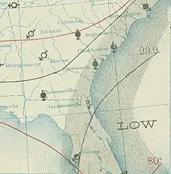The first tropical cyclone of the season developed on August 23, in the eastern Caribbean Sea.[4] Not believed to have strengthened further, the storm tracked west-northwestward and struck southwestern Hispaniola. It quickly weakened to a tropical depression as it turned more toward the northwest and crossed northern Cuba. On August 26, the depression passed through the Bahamas, east of the Florida Peninsula. Heading due north, the storm had transitioned into an extratropical cyclone by the next day.[5] An area of high pressure to the north and east of the storm was said to have prevented it from recurving out to sea,[4] and the cyclone skirted the eastern coast of North Carolina before being listed as dissipated east of the Delmarva Peninsula. The storm reportedly caused heavy precipitation on August 29 and 30 in Georgia and the Carolinas, while ships at sea reported high winds, rough seas and heavy rainfall.[5]