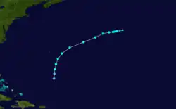 Historical weather maps indicate that a trough became a tropical storm by August 27 about 1,115 mi (1,795 km) east-northeast of Guadeloupe.[2] Moving northwestward and slowly strengthening, the storm became a hurricane early on August 30. After reaching Category 2 intensity at 00:00 UTC on September 1, the cyclone turned west-northwestward.[3] About 24 hours later, the storm intensified into a Category 3 hurricane and soon peaked with winds of 120 mph (195 km/h) and a minimum pressure of 985 mbar (29.1 inHg).[2] The hurricane then meandered slowly around Bermuda, passing just 25 mi (40 km) north of the island around 06:00 UTC September 3. Thereafter, the system turned southeastward and passed roughly the same distance west of Bermuda about 18 hours later. On September 6, the cyclone weakened to a Category 2 hurricane and curved to the west. Veering north-northeastward on September 7, the storm fell to Category 1 intensity about two days later. A northeastward motion commenced, and the system weakened to a tropical storm on September 10.[3] The storm became extratropical several hours later while being absorbed by a frontal system about 345 mi (555 km) south of Sable Island.[3][2]