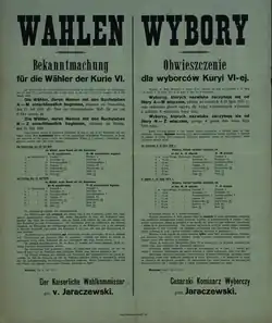 The German occupation authorities ultimately rejected the Warsaw Citizens Committee April 1916 draft electoral ordinance, and instead opted for an electoral ordinance based on the Prussian system of separate and unequal curiae.[1] On May 28, 1916, the German occupation authorities issued a bulletin with the provisions for the election of the Warsaw City Council.[9] The electoral regulation mixed a system of curiae with proportional election (except in the Third Curia).[9] The new City Council would have 90 seats.[9] Candidates had to be men over the age of 30 years, with "spotless moral and political reputation" and fluent Polish language skills.[9][4] Voting rights were given to men aged over 25 years.[9][4] Moreover, a small number of wealthy and educated women were given the right to vote, albeit only through a male proxy.[9][4] The German authorities divided the voters into six curiae, with each of the curiae being allotted 15 seats in the City Council.[4] On June 4, 1916, Warsaw residents began entering their names in electoral rolls of the six curiae.[6] Initially interest in the election was low, but the electoral campaign soon captured the attention of the city.[6] All in all by late June 1916, there were a total of 82,223 registered voters.[10]