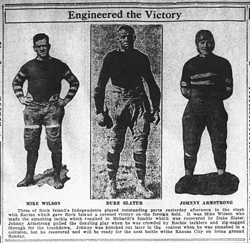 - ^ a b c "Rock Island Independents Lose to Kansas City by 23 to 7 Count: Absence of Duke Slater is Serious Handicap to Rube Ursella's Eleven: Kansas City Grid Officials Will Not Permit Colored Boy to Play," Davenport Daily Times, Oct. 27, 1924, p. 11.