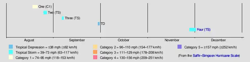 The season's activity was reflected with an accumulated cyclone energy (ACE) rating of 7,[3] one of the lowest totals ever and far below the 1921–1930 average of 76.6.[3][4] ACE is a metric used to express the energy used by a tropical cyclone during its lifetime. Therefore, a storm with a longer duration will have high values of ACE. It is only calculated at six-hour increments in which specific tropical and subtropical systems are either at or above sustained wind speeds of 39 mph (63 km/h), which is the threshold for tropical storm intensity. Thus, tropical depressions are not included here.[3]