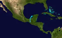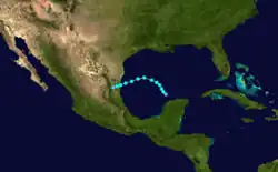 An area of disturbed weather persisted across the northwestern Caribbean Sea in early October. It tracked northwestward over the Yucatán Peninsula, and subsequent to the development of a low-level circulation the system organized into a tropical storm on October 9 while located about 60 mi (95 km) northwest of the capital of Campeche. After moving northward, the storm turned sharply southward, and made landfall in northern Tabasco as a minimal tropical storm on October 10. The system quickly weakened over land, and dissipated over Chiapas on October 11.[9] The system dropped heavy rainfall across southeastern Mexico, though damage, if any, is unknown.[1]