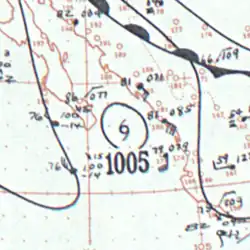 On July 3, a tropical cyclone was spotted, and a pressure of 99.55 kPa (29.40 inHg) was reported. It possibly headed northeast, towards Cape Corrientes, as a tropical cyclone was spotted in that direction on July 6. However, it is possible that these observations were actually of two different tropical cyclones.[1]