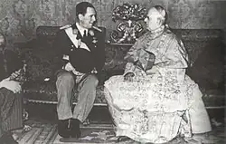 President Juan Perón and Cardinal Copello confer shortly after the approval of the 1949 Constitution. Perón maintained the Church's support for his early reforms by assuring the curia a voice in his ambitious agenda.