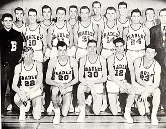 The 1949–50 Bradley Braves men's basketball team represented Bradley University in college basketball during the 1949–50 season. The team finished the season with a 32–5 record[1] and were national runners-up to the City College of New York (CCNY) in both the 1950 NCAA tournament and 1950 National Invitation Tournament. Early on in the NCAA Tournament's days, which began in 1939, teams were allowed to participate in both it and the NIT. The 1949–50 college basketball season is noteworthy in that it is the only year in which a team won both tournaments (CCNY), and the losing team of both championships happened to be Bradley. Coincidentally enough, a year later, several of Bradley's players from this season's team would be instigated as individuals involved in what would later be known as the CCNY point-shaving scandal due to the biggest noise coming from the scandal at the time involving CCNY despite the fact that seven different universities had players involved in the scandal at the time, including Bradley.