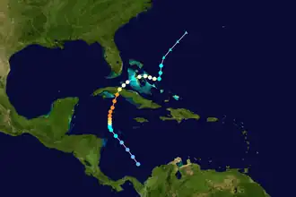 The strongest tropical cyclone of the season formed on October 20 in the Caribbean Sea off the northwest coast of Colombia,[4] believed to have been from the Intertropical Convergence Zone.[1] It moved northwestward, intensifying into a tropical storm on October 21 and a hurricane the following day. Fox subsequently turned to the north, intensifying to a major hurricane as it passed west of the Cayman Islands. Late on October 24, the cyclone struck the small island of Cayo Guano del Estes in the Archipelago de los Canarreos, south of Cienfuegos, Cuba. It struck the island with peak winds of 145 mph (233 km/h), and the island reported a minimum pressure of 934 millibars (27.6 inHg). Shortly thereafter, Fox crossed the mainland coast of Cuba west of Cienfuegos, and it weakened while crossing the island.[4][1]