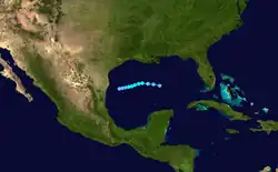 A low pressure area was present north of the Yucatán Peninsula on September 14. Nearby ship observations indicated that a tropical depression developed the next day in the central Gulf of Mexico, although the system's large structure meant it could have been a subtropical cyclone. The system moved slowly westward, bringing winds of 30 mph (48 km/h) to the coast of Louisiana. It is estimated that the storm reached peak winds of 45 mph (72 km/h) on September 16, based on reports from ships and the Hurricane Hunters. On the next day, the system began weakening over water, dissipating on September 18 without moving ashore.[11]