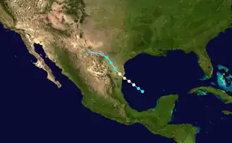 On June 24, Tropical Storm Alice developed. It rapidly intensified in the western Gulf of Mexico,[6] giving the citizens of southern Texas and northeastern Mexico little time to prepare.[12] By June 25, Alice intensified to hurricane status, reaching peak winds of 110 mph (180 km/h) that day, before making landfall in northeastern Mexico, just south of the Mexico–United States border. The storm progressed inland along the Rio Grande Valley, dissipating on June 27.[11]