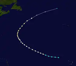An easterly tropical wave developed into a tropical depression on August 21 in the tropical Atlantic.[4] Moving towards the west-northwest, the disturbance slowly intensified, reaching tropical storm strength at 1200 UTC on August 23 and as such was named Edith by the Weather Bureau.[7][27] Afterwards, Edith began to curve towards the northwest as it gradually intensified, attaining hurricane strength on August 26, but weakened back to a tropical storm early the next day. The storm re-intensified as it northeastward and accelerated, re-attaining hurricane status early on August 29. Edith became a Category 2 hurricane on August 30 and soon peaked with maximum sustained winds of 100 mph (160 km/h) and a minimum pressure of 967 mbar (28.6 inHg).[7] The hurricane began to gradually weaken after it passed east of the island, before becoming extratropical on August 31. The extratropical cyclone would later make a clockwise loop before dissipating completely early on September 5. Although Edith remained at sea,[7] it was suspected that the hurricane may have caused the loss of the pleasure yacht Connemara IV, after it separated from its moorings.[28]