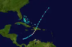 A disturbance in the ITCZ developed into a tropical depression north of Panama on October 14. Early on the following day, the depression strengthened into Tropical Storm Katie. The system moved generally northeast due to the presence of a strong low pressure area along the East Coast of the United States.[4][54] Later that day, Hurricane Hunters observed a rapidly intensifying hurricane, encountering winds of 110 mph (180 km/h) and a pressure of 984 mbar (29.1 inHg) several hours before the peak intensity. Early on October 17, Katie made landfall in extreme eastern Sud-Est, Haiti, as a strong Category 2 hurricane (although it may have been stronger). About half of homes in the town of Anse-à-Pitres were destroyed.[55] Across the border in Pedernales, Dominican Republic, 68 houses were damaged. Overall losses were at least $200,000 and 7 fatalities were reported.[4]