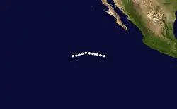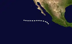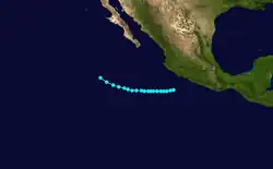 On June 11, a small low pressure system was first identified around 300 mi (480 km) south of the Gulf of Tehuantepec, producing sustained winds which neared 30 mph (50 km/h).[2] By 12:00 UTC the next day, the system intensified into a hurricane with sustained winds of 85 mph (140 km/h),[1] with nearby ship reports indicating that the storm was producing sustained gales. Moving west-northwestward slowly, on June 13, reports from the Portland Star indicated that the hurricane had deepened into a minimum pressure of 29.06 inHg (984 hPa) and was producing gusts exceeding 115 mph (185 km/h).[2] Never intensifying further than 85 mph (140 km/h), the hurricane tracked north-northwestwards prior to making landfall around 150 mi (240 km) east-southeast of Manzanillo, in the state of Guerrero.[1][2] Weakening rapidly, the hurricane was last noted on June 14.[1][2]