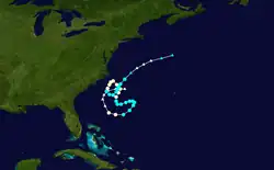 On September 29, reconnaissance aircraft indicated the formation of a tropical depression to the east of the Lesser Antilles. For several days it moved to the west-northwest, passing just north of the islands without intensifying further. This was due to its presence beneath an upper-level trough, although the system began intensifying as the trough dissipated. On October 2, after turning to the northwest between two high-pressure areas, the depression strengthened into Tropical Storm Daisy. Developing an anticyclone aloft, the storm continued to gradually intensify, reaching hurricane strength on October 3.[6] Two days later, Daisy turned to the north-northeast and attained peak winds of 105 mph (165 km/h). Cool air imparted weakening as Daisy turned northwestward, and on October 7, the storm transitioned into an extratropical about 185 mi (300 km) east of Chatham, Massachusetts. On the following day, the extratropical remnants of Daisy struck Nova Scotia just south of Yarmouth and later re-emerged into the Atlantic, before dissipating south of Newfoundland on October 9.[3]
