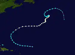 A tropical wave moved through the northeastern Caribbean on October 10, with a large area of associated thunderstorms. The wave interacted with a stalled frontal boundary, developing a broad circulation by October 13 to the northeast of the Bahamas. A day later, the system developed into a subtropical storm – its classification was because the system was co-located with a trough. There was another area of convection along the front northeast of the subtropical storm, which accelerated northeastward. Meanwhile, the subtropical storm turned westward. It had a small circulation with thunderstorms sheared north of the center, which gradually became more organized. On October 17, an approaching front turned the storm northward and later northeastward. On the same day, the subtropical storm transitioned into a tropical cyclone. On the next day, the storm attained peak winds of 60 mph (97 km/h), before it transitioned into an extratropical cyclone over Atlantic Canada, where it was ultimately absorbed by the cold front on October 19.[3]