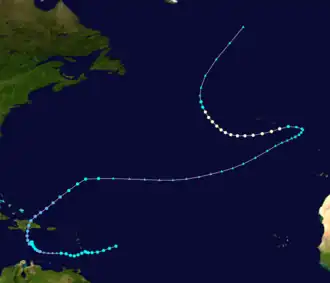A tropical wave exited the west coast of Africa September 24, and for several days maintained a general westward track. On September 30, a flight from the Hurricane Hunters observed a well-defined circulation, while ships in the area reported gale-force winds; these observations indicated that a tropical storm had developed. The storm moved west-southwestward, passing St. Lucia and St. Vincent into the Caribbean Sea on October 2. It weakened thereafter, briefly degenerating into a trough before redeveloping into a tropical depression on October 5. It re-intensified into a tropical storm as it meandered south of Hispaniola, eventually hitting the Dominican Republic on October 8 as a tropical depression. It crossed the island into the Atlantic and moved northeastward ahead of an approaching cold front, briefly becoming a tropical storm again on October 10. The storm became extratropical as it integrated with the trough on October 11, moving quickly to the east and east-northeast. Thunderstorms increased on October 14, and a day later, the stalled about halfway between the Azores and Madeira due to a ridge over northern Europe. By that time, the system became integrated with an upper-level low while no longer associated with the front; as a result, it became a subtropical storm. Turning back to the west, the storm re-intensified, becoming a fully tropical hurricane on October 17. A day later, it attained peak winds of 85 mph (135 km/h). The hurricane turned to the north, weakening back to a tropical storm on October 20. A day later, it transitioned into an extratropical cyclone, which was absorbed by another cyclone southeast of Greenland on October 22.[21]