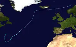On October 12, a subtropical depression developed while located northeast of the Bahamas. It steadily intensified and became a subtropical storm by the following day. After tracking east-northeastward, the storm made a sharp westward turned, followed by a curve to the north-northeast. After fully acquiring tropical characteristics, the subtropical storm transitioned into a tropical cyclone early on October 16. Twelve hours later, the storm strengthened into a hurricane,[3] shortly before passing near Bermuda.[51] It continued to intensify and briefly became a Category 2 hurricane on October 17. The hurricane then accelerated rapidly northeastward,[3] and made landfall on the Avalon Peninsula of Newfoundland as a Category 1 hurricane. Shortly thereafter, the hurricane transitioned into an extratropical cyclone on October 17.[3][52]