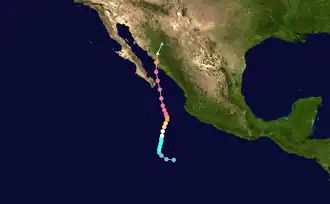 A tropical disturbance was first noted about 345 miles (555 km) south of the Guatemalan coastline on September 27.[2] It organized into Tropical Storm Madeline by 00:00 UTC on September 29 but failed to further develop, instead weakening to a tropical depression the next morning. By 00:00 UTC on October 4, Madeline re-intensified into a tropical storm, beginning a gradual curve toward the north as well. The system continued to strengthen and became a hurricane early on October 6; by 06:00 UTC on October 8, Madline peaked as a Category 4 hurricane with winds of 145 mph (233 km/h). It moved onshore the coastline of Mexico a few hours later, rapidly weakening and losing its status as a tropical cyclone after 18:00 UTC that day.[3]