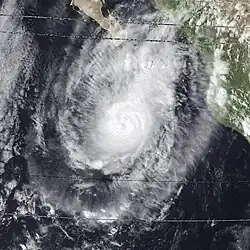 An area of disturbed weather spawned by a tropical wave developed southeast of Acapulco on July 11 and rapidly grew in size.[5] It developed into a tropical depression around 00:00 UTC on July 13 and further into Tropical Storm Gilma six hours later while curving from west-southwest to west-northwest.[5][6] Further organization brought Gilma to hurricane strength around 18:00 UTC on July 15 and major hurricane intensity by 06:00 UTC the next day.[6] By this point, satellite imagery revealed a system with a cloud shield about 920 mi (1,480 km) in diameter and an eye about 15 mi (25 km) wide. Immediately after peak, the effects of cold waters and dry air began to affect Gilma, and the storm weakened rapidly.[5] It degenerated to a disturbance after 00:00 UTC on July 20 while located well west of Baja California.[6] Its well-defined circulation tracked north of Hawaii before dissipating on July 27.[7]