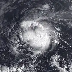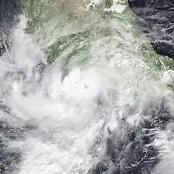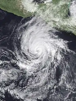 Ignacio turned north and then veered sharply east, entering colder waters. Subsequent reconnaissance of the storm found various changes to its internal structure, including a pinhole eye down to 6 miles (9.7 km) in diameter before it ultimately became ill-defined. Ignacio accelerated toward the Mexico coastline, and around 12:00 UTC on October 30 struck about 160 miles (260 km) east-southeast of Manzanillo, Colima, with much-weakened winds of 35 mph (56 km/h).[4] It transitioned into an extratropical cyclone six hours later, then dissipated over the Yucatán Peninsula the next day.[7][4]