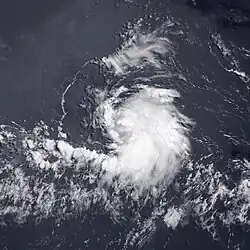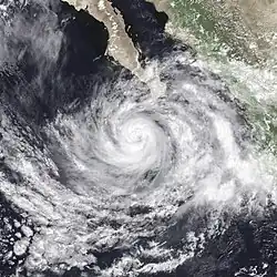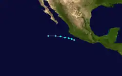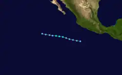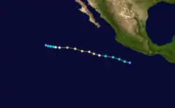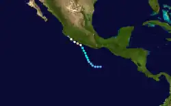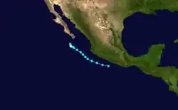 An area of disturbed weather formed south of the Gulf of Tehuantepec on September 7.[4] It organized into a tropical depression around 18:00 UTC on September 8 and intensified into Tropical Storm Guillermo twelve hours later.[7] Flow around the southwest side of upper-level ridging directed the storm to curve northwestward, while the system's track over warm waters allowed it to intensify. It became a hurricane with peak winds of 75 mph (121 km/h) around 18:00 UTC on September 11. Guillermo decelerated over cooler waters south of Baja California,[4] ultimately dissipating after 12:00 UTC on September 13.[7]
